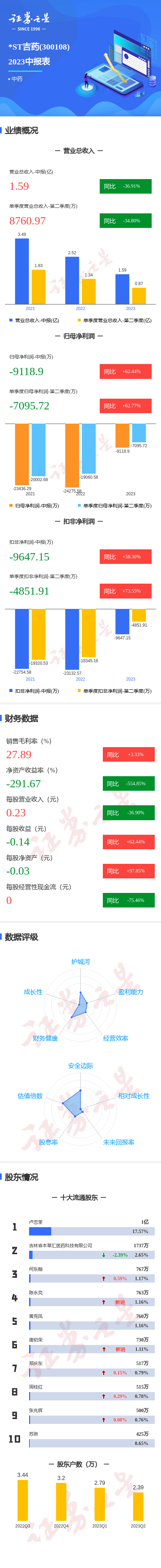 *ST吉药2023中报显示,公司主营收入1.59亿元,同比下降36.91%;归母净利润-9118.9万元,同比上升62.44%;扣非净利润-9647.15万元,同比上升58.3%;其中2023年第二季度,公司单季度主营收入8760.97万元,同比下降34.8%;单季度归母净利润-7095.72万元,同比上升62.77%;单季度扣非净利润-4851.91万元,同比上升73.55%;负债率123.34%,投资收益1994.39万元,财务费用8072.71万元,毛利率27.89%。