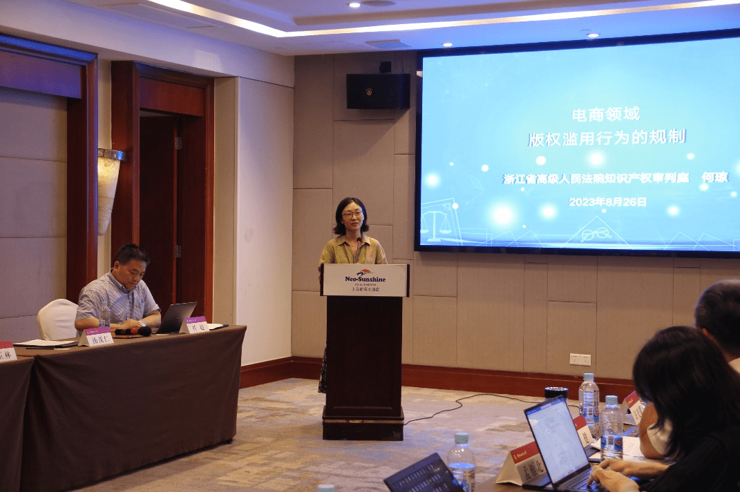 “强化知识产权保护,依法保护著作权人的权利是很有必要的,这样才能激发创作者的创新活力。”浙江高院知识产权庭副庭长何琼,为大家带来版权领域内知识产权滥用的部分案例分享,包括花样版权抢注案例、未提供底稿和版权证书自动取得著作权等。何琼表示,“小商家没有举证能力,或缺乏出庭应诉意识等诸多问题,都会导致市场环境和知识产权保护环境变差,对这方面问题仍需加强规制。”