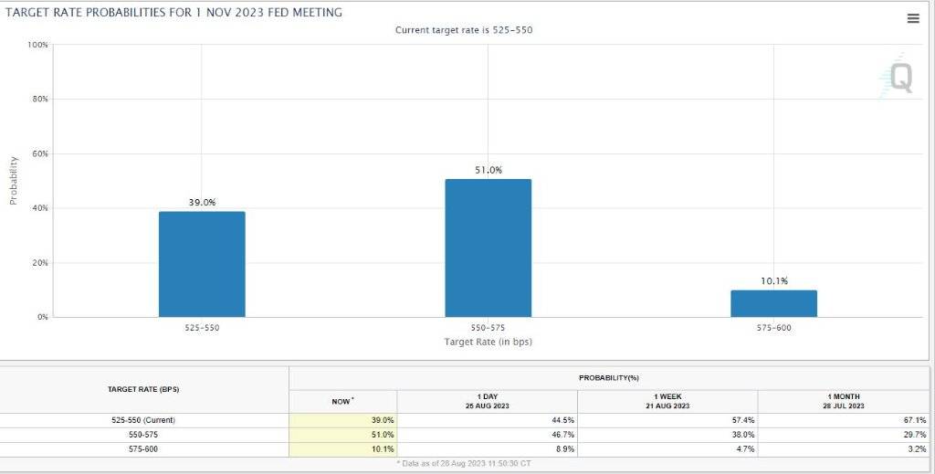 市场也持续消化上周五美联储主席鲍威尔的鹰派讲话,交易员认为9月美联储按兵不动的概率为80%,但11月恢复加息25个基点的概率从一周前的33%提升至51%。