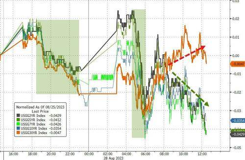 短端美债收益率在美股盘初转涨,对货币政策更敏感的两年期收益率日内最高涨5个基点至5.10%,美股午盘后回吐涨幅重新转跌,仍徘徊7月6日以来的逾六周高位。