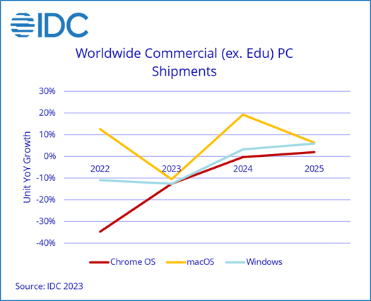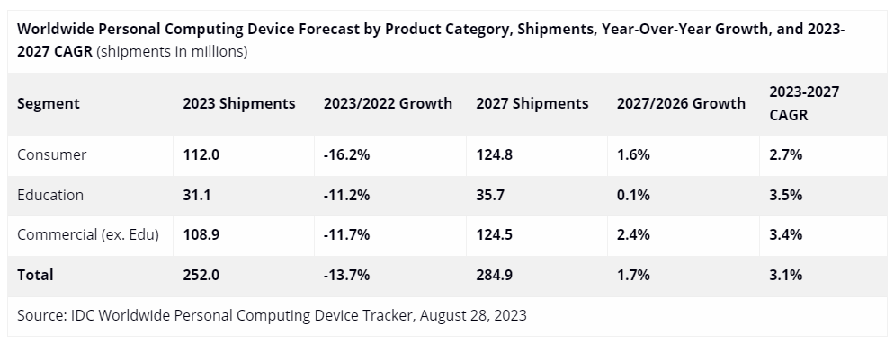 IDC 认为当前 PC 行业依然面临诸多挑战,包括消费市场更新周期拉长、企业降低采购预算、很多市场的教育支出尚未反弹等等,因此预估 2023 年的出货量为 2.52 亿台,同比下降 13.7%。