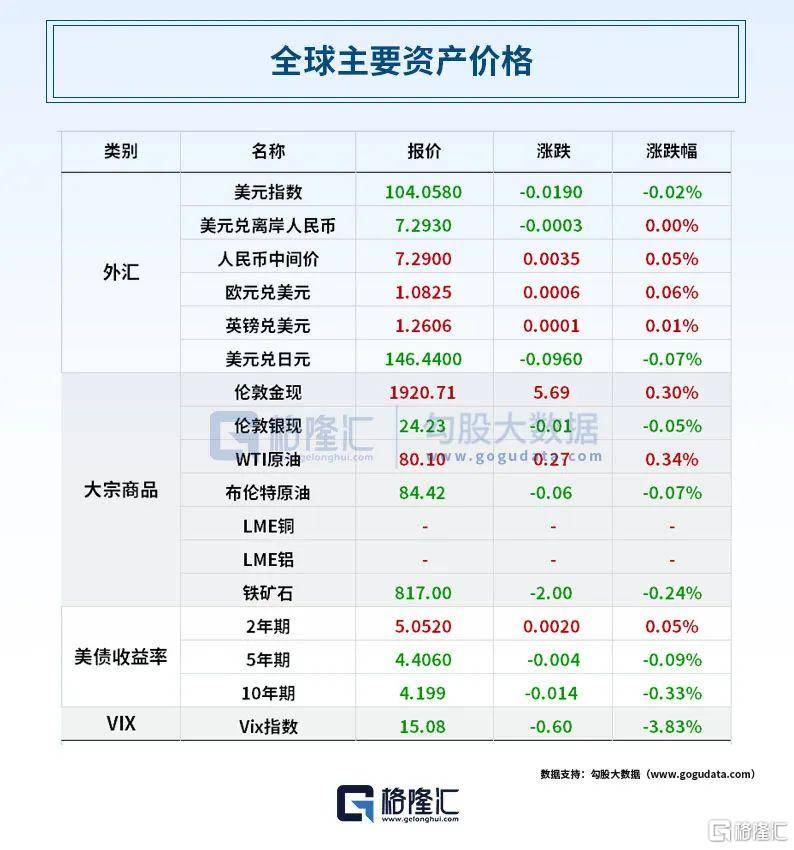 全球资产表现上,短端美债收益率徘徊逾于六周高位,美元站稳104,徘徊于十二周最高,日元刷新九个半月最低,离岸人民币一度跌穿7.3元或跌200点。WTI 10月原油期货收涨0.27美元,涨幅0.34%,报80.10美元/桶。布伦特10月期货收跌0.06美元,跌幅0.07%,报84.42美元/桶。现货黄金并升破1920美元整数位,至近三周新高。