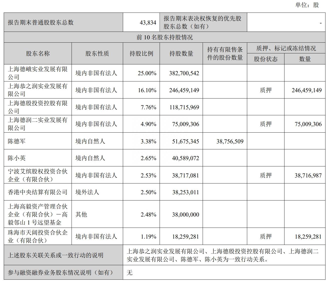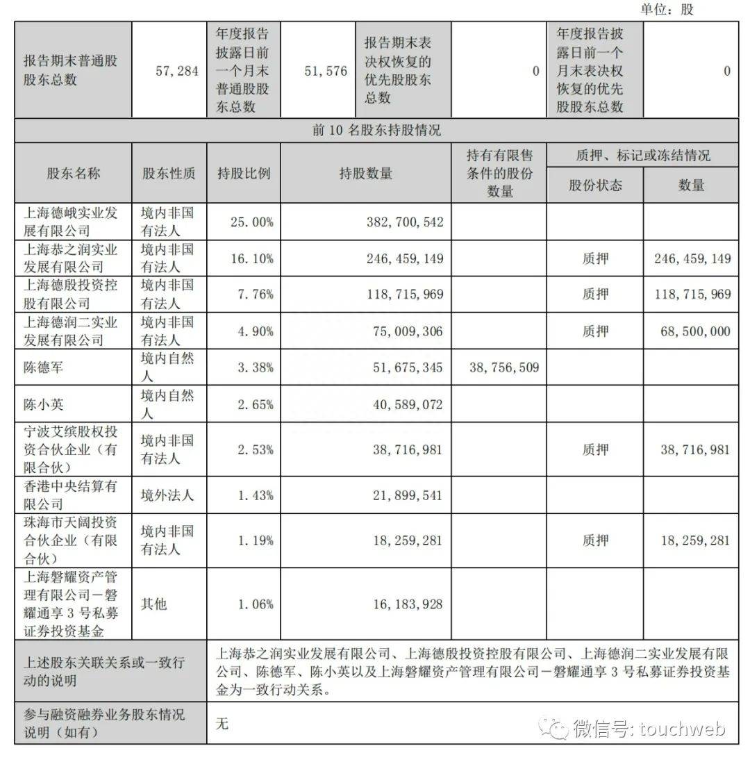 截至2022年12月31日,上海德峨实业发展有限公司持股为25%,上海恭之润实业发展有限公司持股为16.1%,上海德殷投资控股有限公司持股为7.76%,上海德润二实业发展有限公司持股为4.9%;