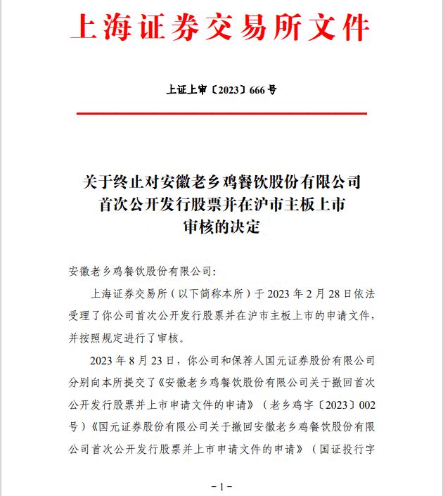 据了解,8月23日,老乡鸡和保荐人国元证券分别向上交所提交文件,申请撤回申请文件。根据《上海证券交易所股票发行上市审核规则》第六十三条的有关规定,上交所决定终止对公司首次公开发行股票并在沪市主板上市的审核。
