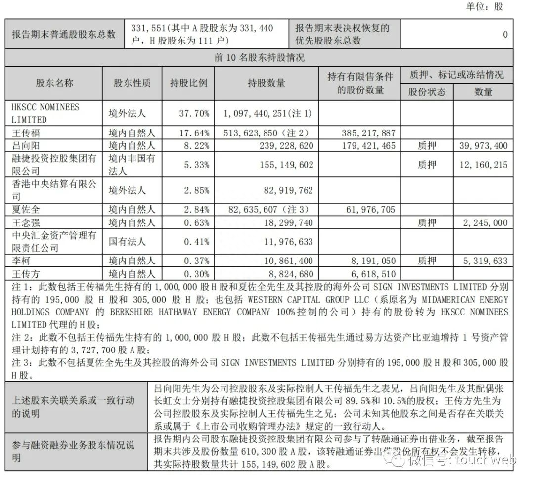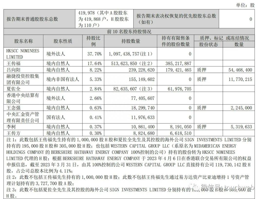 此数包括王传福持有的 1,000,000 股H股和夏佐全及其控股的海外公司SIGN INVESTMENTS LIMITED 分别持有的195,000股H股和305,000 股 H 股;也包括WESTERN CAPITAL GROUP LLC(系原名为 MIDAMERICAN ENERGY HOLDINGS COMPANY 的 BERKSHIRE HATHAWAY ENERGY COMPANY 100%控制的公司)持有股份转为HKSCC NOMINEES LIMITED 代理的H股;
