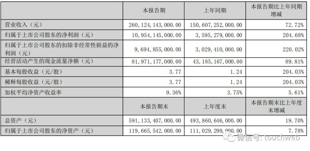 比亚迪2023年上半年净利109.54亿,较上年同期的35.95亿元增长204.68%;扣非后净利96.95亿元,较上年同期的30.29亿元增长220%。
