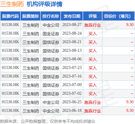 截至2023年8月28日收盘,三生制药(01530.HK)报收于6.68港元,上涨0.0%,换手率0.23%,成交量555.55万股,成交额3731.65万港元。投行对该股的评级以买入为主,近90天内共有8家投行给出买入评级,近90天的目标均价为9.3港元。中金公司最新一份研报给予三生制药跑赢行业评级,目标价9.3港元。