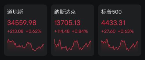 截至收盘,道指涨213.08点,涨幅为0.62%,报34559.98点;纳指涨114.48点,涨幅为0.84%,报13705.13点;标普500指数涨27.60点,涨幅为0.63%,报4433.31点。