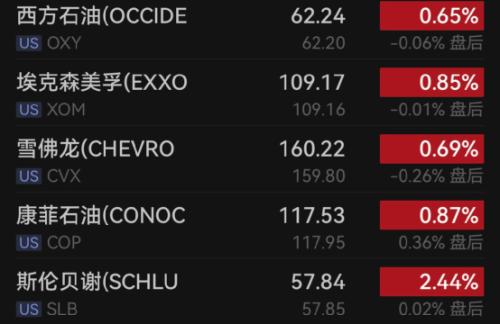 美国能源股集体收涨,埃克森美孚涨0.85%,雪佛龙涨0.69%,康菲石油涨0.87%,斯伦贝谢涨2.44%,西方石油涨0.65%。