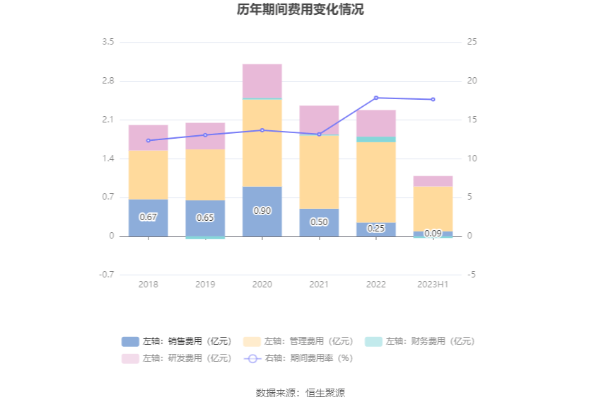 2023年上半年,公司期间费用为1.06亿元,较上年同期减少2832.04万元;期间费用率为17.66%,较上年同期下降3.73个百分点。其中,销售费用同比下降71.13%,管理费用同比增长6.48%,研发费用同比下降10.05%,财务费用由去年同期的503.81万元变为-286.29万元。