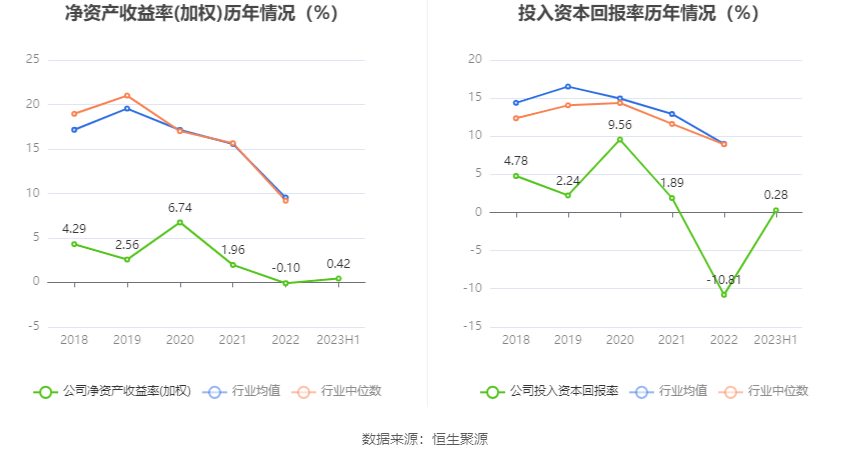 数据显示,2023年上半年公司加权平均净资产收益率为0.42%,较上年同期增长1.84个百分点;公司2023年上半年投入资本回报率为0.28%,较上年同期增长1.46个百分点。