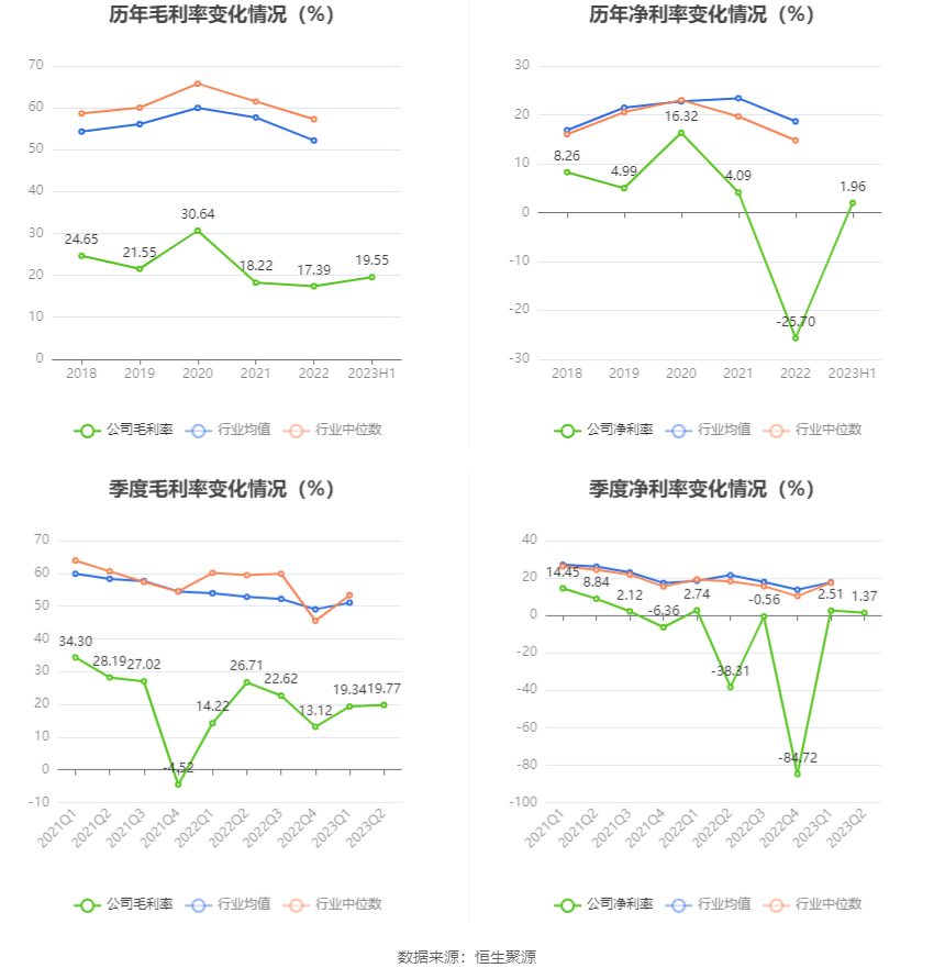 2023年上半年,公司毛利率为19.55%,同比上升2.47个百分点;净利率为1.96%,较上年同期上升8.61个百分点。从单季度指标来看,2023年第二季度公司毛利率为19.77%,同比下降6.94个百分点,环比上升0.43个百分点;净利率为1.37%,较上年同期上升39.68个百分点,较上一季度下降1.14个百分点。