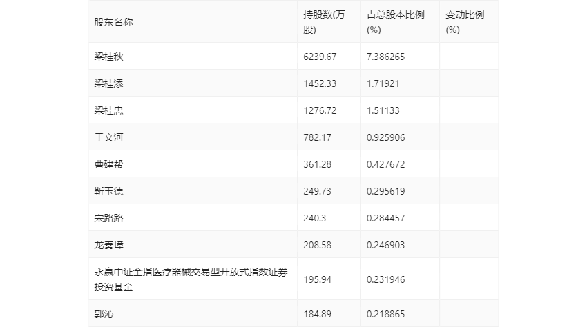 半年报显示,2023年上半年末的公司十大流通股东中,新进股东为龙奏璋、永赢中证全指医疗器械交易型开放式指数证券投资基金,取代了一季度末的高华-汇丰-GOLDMAN,SACHS&CO.LLC、李硕。在具体持股比例上,于文河持股有所上升,梁桂秋、梁桂添、梁桂忠、宋路路、郭沁持股有所下降。