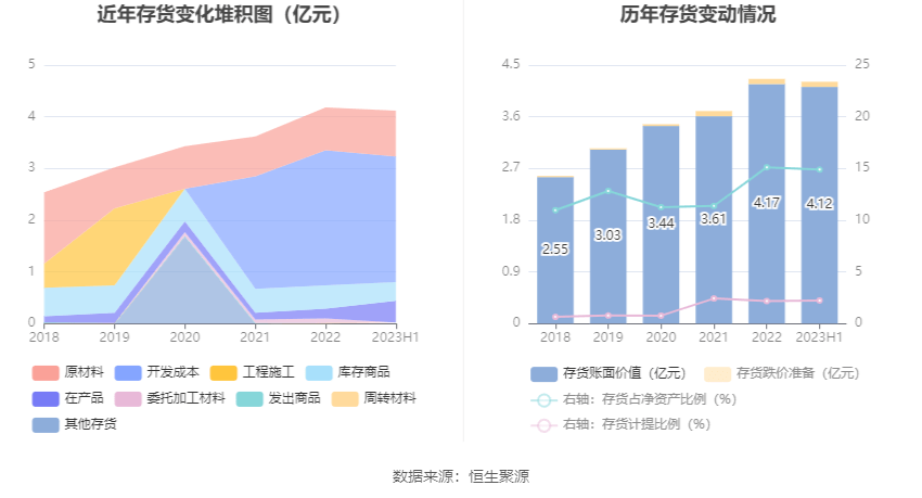 从存货变动来看,截至2023年上半年末,公司存货账面价值为4.12亿元,占净资产的14.89%,较上年末减少471.23万元。其中,存货跌价准备为946.07万元,计提比例为2.24%。