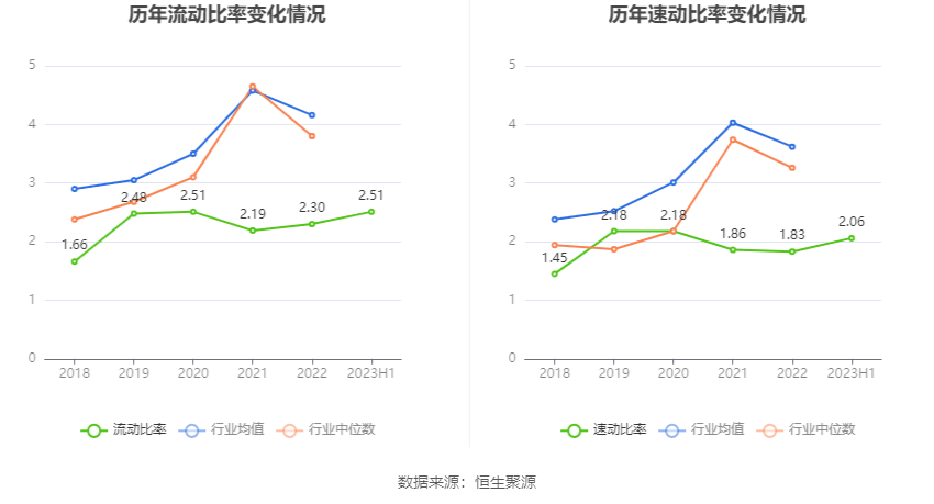 2023年上半年,公司流动比率为2.51,速动比率为2.06。
