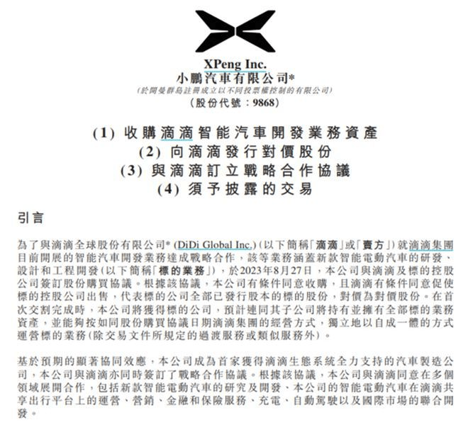 为推动双方合作并加深关系,小鹏汽车将发行占交易完成后总股本3.25%的A类普通股,收购滴滴旗下智能电动汽车项目相关资产和研发能力。预计此次收购的最高总对价为 58.35 亿港元,交易完成后滴滴将成为小鹏汽车的战略股东,首批股份的锁定期为24个月。