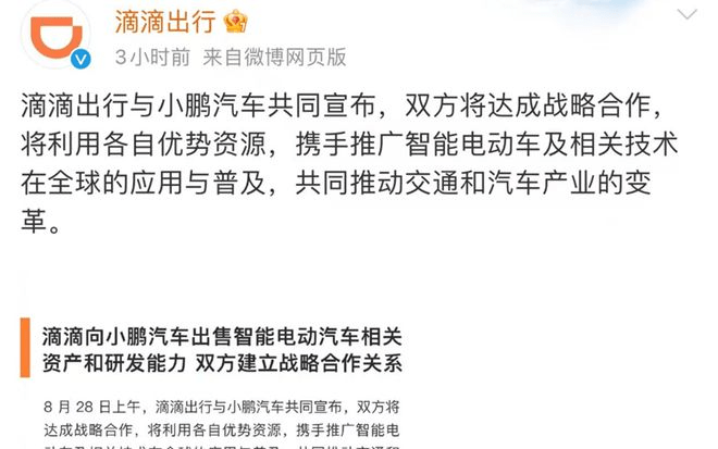 根据此次合作公告来看,小鹏十分看好与滴滴的合作前景。目前小鹏汽车的新品牌会成为首家获得滴滴生态系统全力支持的汽车制造公司。与此同时,新汽车品牌会与滴滴在未来多个领域展开合作,涉及到新款智能电动汽车的研究及开发、公司的智能电动汽车在滴滴共享出行平台上的运营、营销、金融和保险服务、充电、自动驾驶以及国际市场的联合开发。