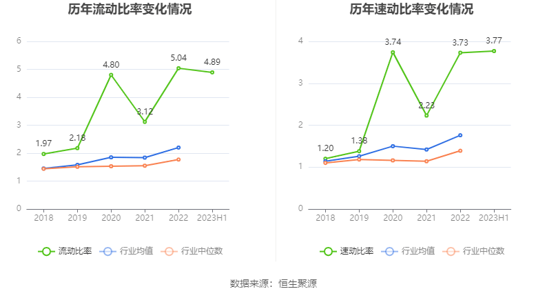 2023年上半年,公司流动比率为4.89,速动比率为3.77。