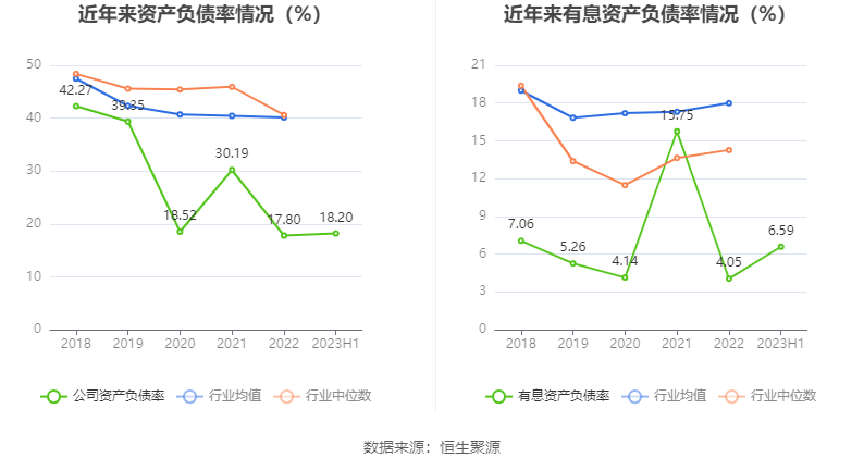 偿债能力方面,公司2023年二季度末资产负债率为18.20%,相比上年末增加0.40个百分点;有息资产负债率为6.59%,相比上年末增加2.54个百分点。