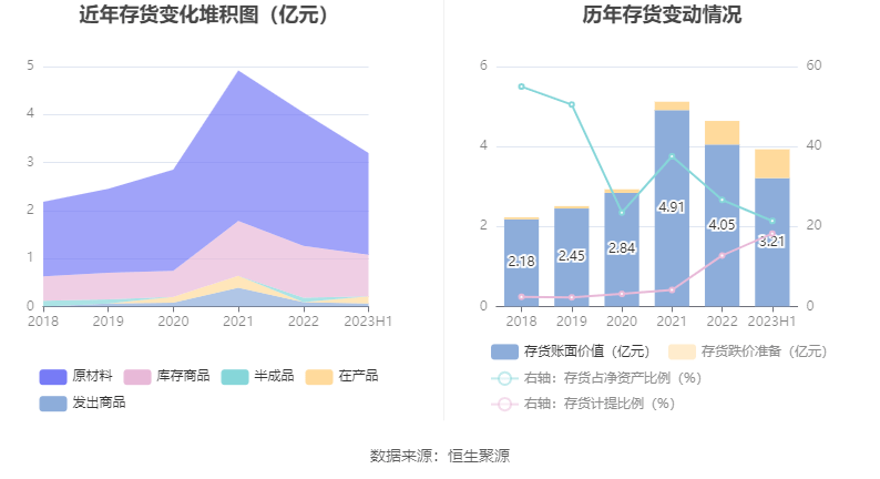 从存货变动来看,截至2023年上半年末,公司存货账面价值为3.21亿元,占净资产的21.38%,较上年末减少8448.67万元。其中,存货跌价准备为7150.08万元,计提比例为18.23%。