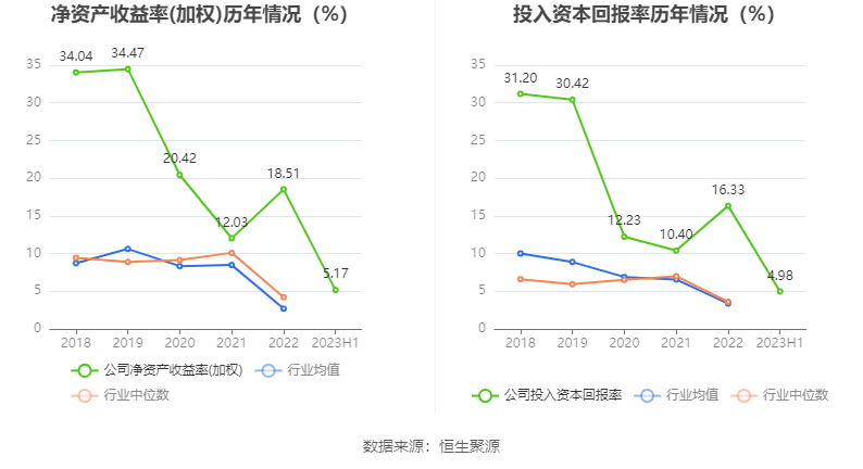 数据显示,2023年上半年公司加权平均净资产收益率为5.17%,较上年同期下降4.77个百分点;公司2023年上半年投入资本回报率为4.98%,较上年同期下降3.74个百分点。