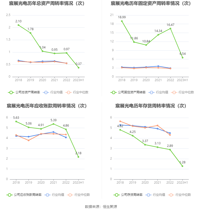 营运能力方面,2023年上半年,公司总资产周转率为0.37次,上年同期为0.53次(2022年上半年行业平均值为0.28次,公司位居同行业7/42);固定资产周转率为6.54次,上年同期为8.93次(2022年上半年行业平均值为1.62次,公司位居同行业1/42);公司应收账款周转率、存货周转率分别为2.18次、1.28次。