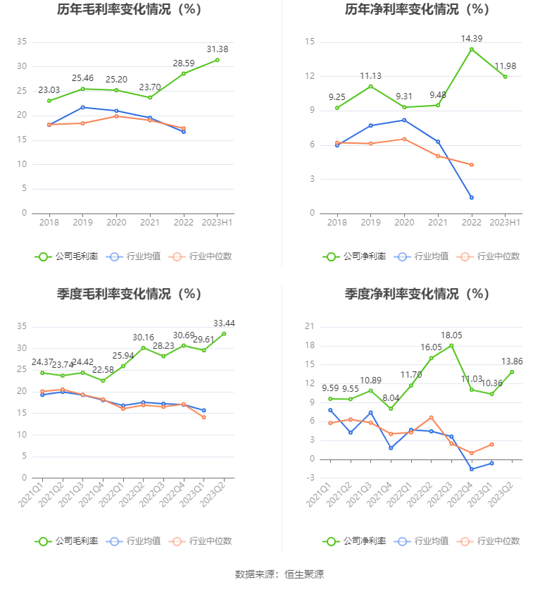 2023年上半年,公司毛利率为31.38%,同比上升3.36个百分点;净利率为11.98%,较上年同期下降1.86个百分点。从单季度指标来看,2023年第二季度公司毛利率为33.44%,同比上升3.28个百分点,环比上升3.83个百分点;净利率为13.86%,较上年同期下降2.19个百分点,较上一季度上升3.50个百分点。