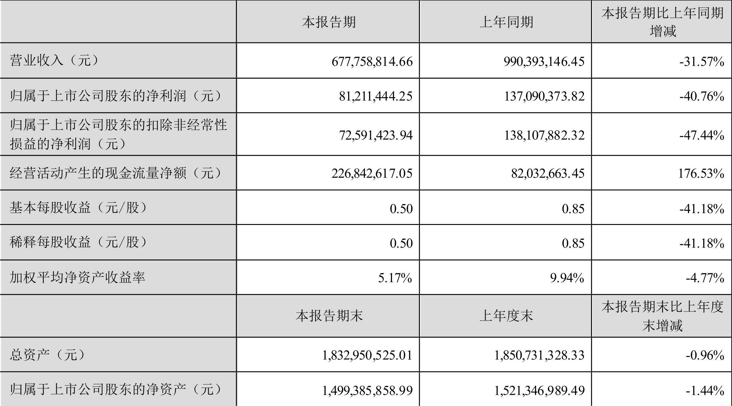 根据半年报,公司第二季度实现营业总收入3.13亿元,同比下降35.65%,环比下降13.97%;归母净利润4345.64万元,同比下降44.42%,环比增长15.10%;扣非净利润4413.99万元,同比下降46.88%,环比增长55.14%。