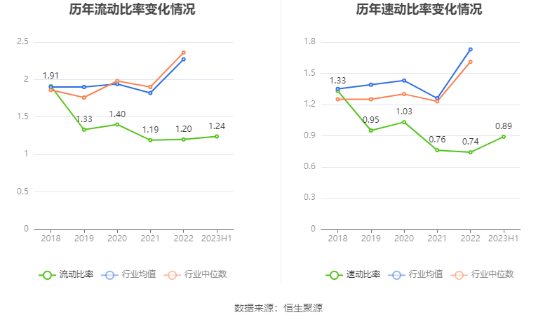 2023年上半年,公司流动比率为1.24,速动比率为0.89。