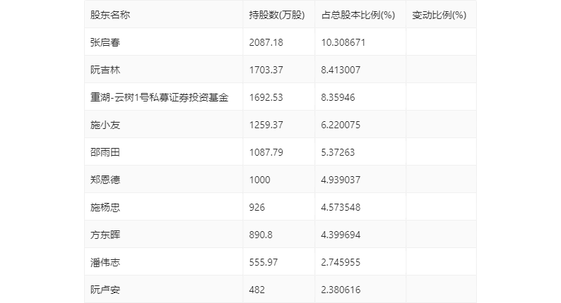 半年报显示,2023年上半年末的公司十大流通股东中,新进股东为重湖-云树1号私募证券投资基金、邵雨田、潘伟志,取代了一季度末的百达控股集团有限公司、台州市创立新材料科技有限公司、张启斌。在具体持股比例上,张启春、阮吉林、施小友、郑恩德、施杨忠、方东晖、阮卢安持股有所上升。
