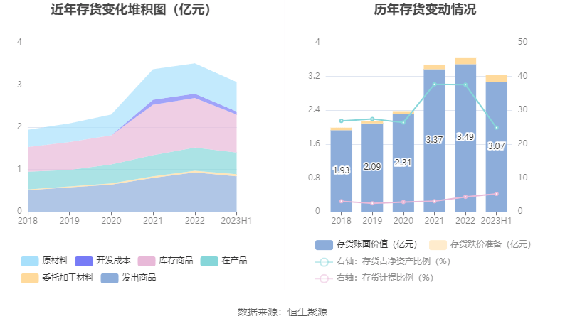从存货变动来看,截至2023年上半年末,公司存货账面价值为3.07亿元,占净资产的24.87%,较上年末减少4278.68万元。其中,存货跌价准备为1714.84万元,计提比例为5.3%。
