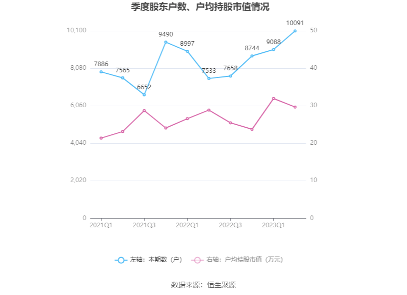 筹码集中度方面,截至2023年二季度末,公司股东总户数为1.01万户,较一季度末增长了1003户,增幅11.04%;户均持股市值由一季度末的31.94万元下降至29.66万元,降幅为7.14%。