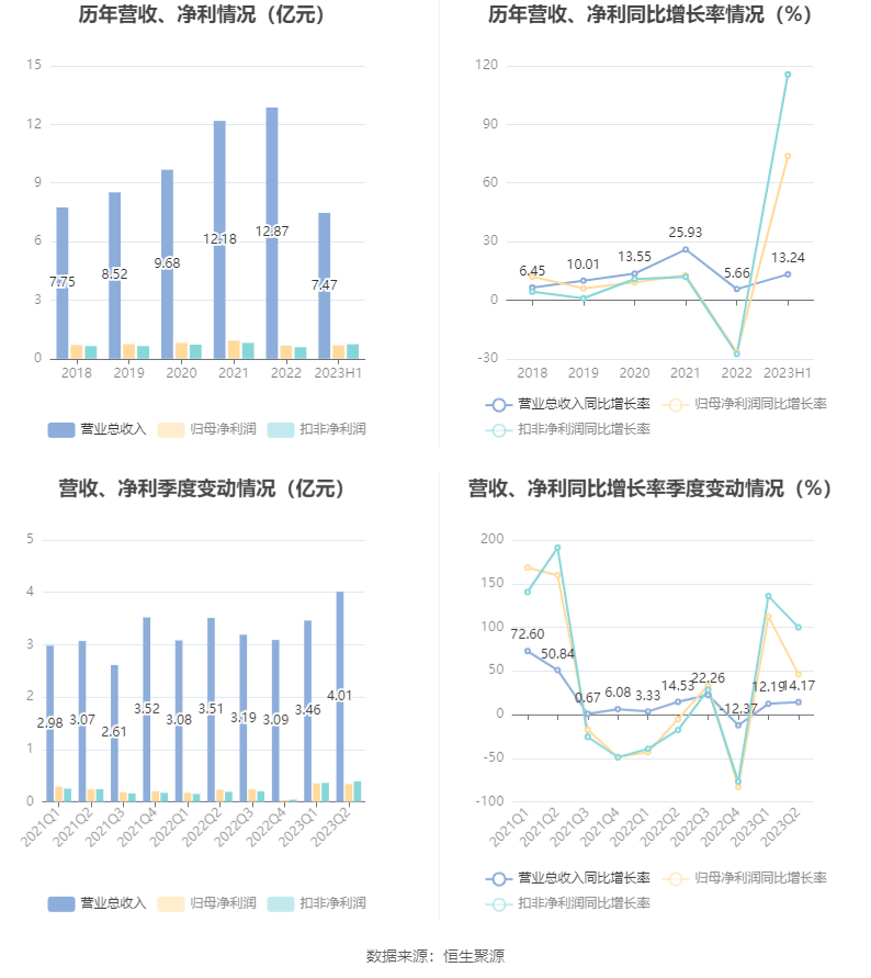 根据半年报,公司第二季度实现营业总收入4.01亿元,同比增长14.17%,环比增长16.00%;归母净利润3365.62万元,同比增长46.08%,环比下降4.14%;扣非净利润3872.57万元,同比增长99.91%,环比增长8.34%。