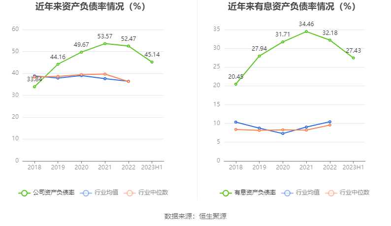 偿债能力方面,公司2023年二季度末资产负债率为45.14%,相比上年末减少7.33个百分点;有息资产负债率为27.43%,相比上年末减少4.75个百分点。