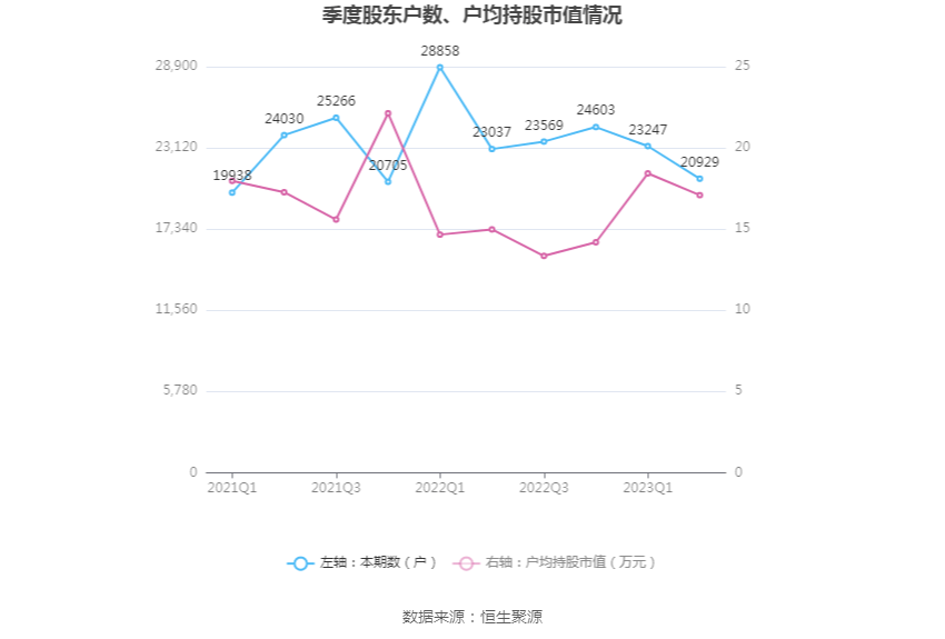 筹码集中度方面,截至2023年二季度末,公司股东总户数为2.09万户,较一季度末下降了2318户,降幅9.97%;户均持股市值由一季度末的18.43万元下降至17.09万元,降幅为7.27%。
