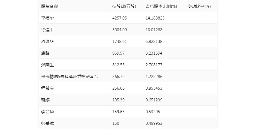 半年报显示,2023年上半年末的公司十大流通股东中,新进股东为徐岳斌,取代了一季度末的王建国。在具体持股比例上,李福华、蒋琳华持股有所下降。