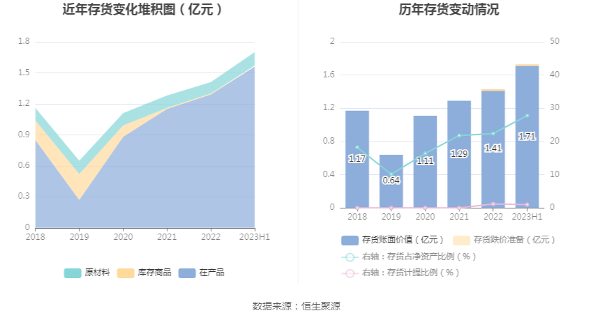 从存货变动来看,截至2023年上半年末,公司存货账面价值为1.71亿元,占净资产的27.8%,较上年末增加3041.06万元。其中,存货跌价准备为172.85万元,计提比例为1.0%。