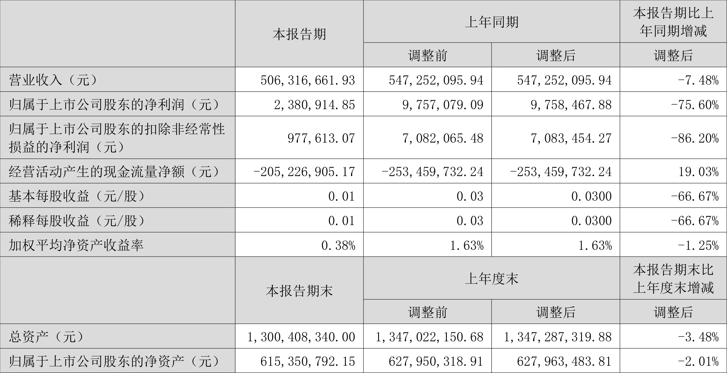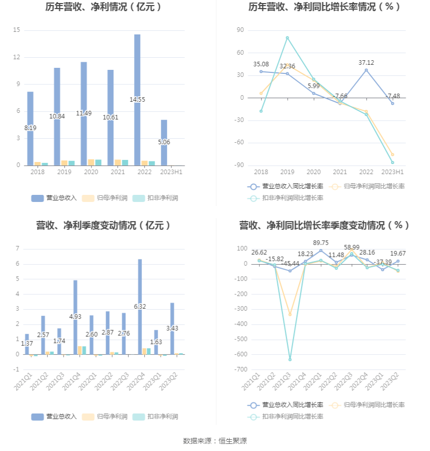 根据半年报,公司第二季度实现营业总收入3.43亿元,同比增长19.67%,环比增长110.58%;归母净利润872.46万元,同比下降47.86%,环比增长237.53%;扣非净利润850.83万元,同比下降41.49%,环比增长212.98%。