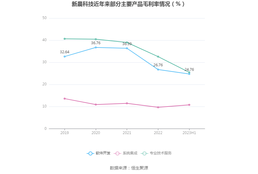 分产品看,软件开发、系统集成、专业技术服务2023年上半年毛利率分别为24.76%、10.81%、25.48%。其中,软件开发、专业技术服务连续3年下降。
