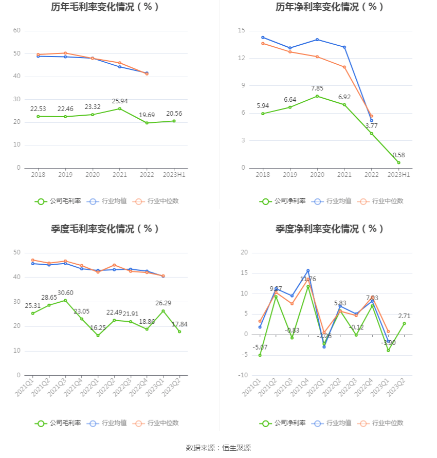 2023年上半年,公司毛利率为20.56%,同比上升1.04个百分点;净利率为0.58%,较上年同期下降1.40个百分点。从单季度指标来看,2023年第二季度公司毛利率为17.84%,同比下降4.65个百分点,环比下降8.45个百分点;净利率为2.71%,较上年同期下降3.12个百分点,较上一季度上升6.61个百分点。
