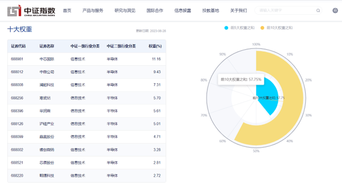截至2023年8月28日,该指数前十大权重股包括中芯国际、中微公司、澜起科技、寒武纪、华润微等,前十大权重股合计占比57.75%。(数据来源:中证指数公司,指数成份股不代表个股推荐)