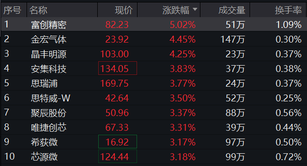 该基金紧密跟踪上证科创板芯片指数,指数成份股中,富创精密上涨5.02%,金宏气体上涨4.45%,晶丰明源上涨4.25%,安集科技、思瑞浦等个股跟涨超3%。