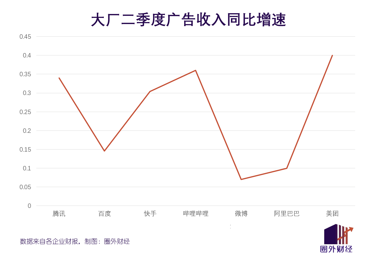 其中,腾讯在线广告业务收入为250亿元,同比增长34%;百度核心广告业务收入则同比增长14.6%至196.32亿元,增速高于市场预期的11.1%;快手二季度广告收入为143.5亿元,同比大涨30.4%。B站、微博的广告业务也稳住了基本盘,前者同比增长36%至15.7亿元,后者则同比增长7%至约27.6亿元。