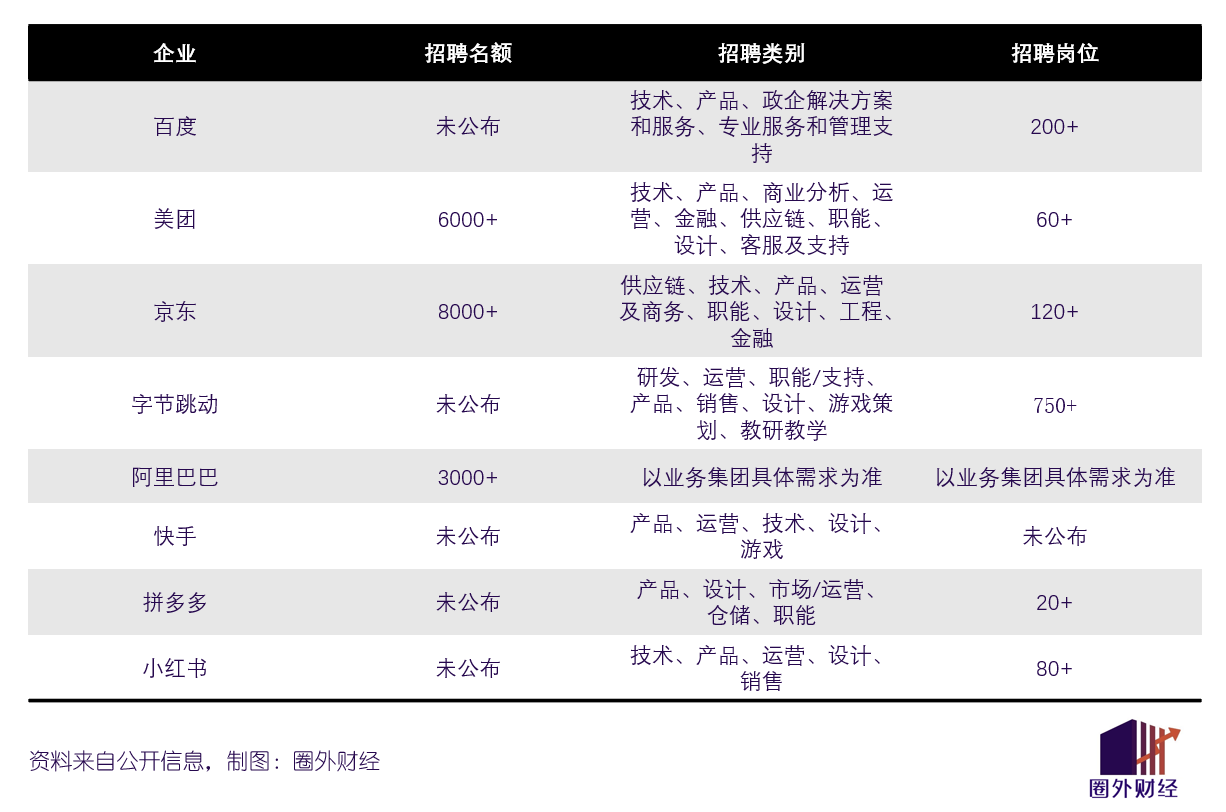 值得注意的是,圈外财经(ID:quanwaicaijing)在此前的报道《又是一年秋招时,互联网大厂不再降本增效》里已经分析过,美团、京东、百度、字节跳动等大厂的校招规模、岗位类型都赶超去年,侧面表明大厂已经做好重启扩张的准备。