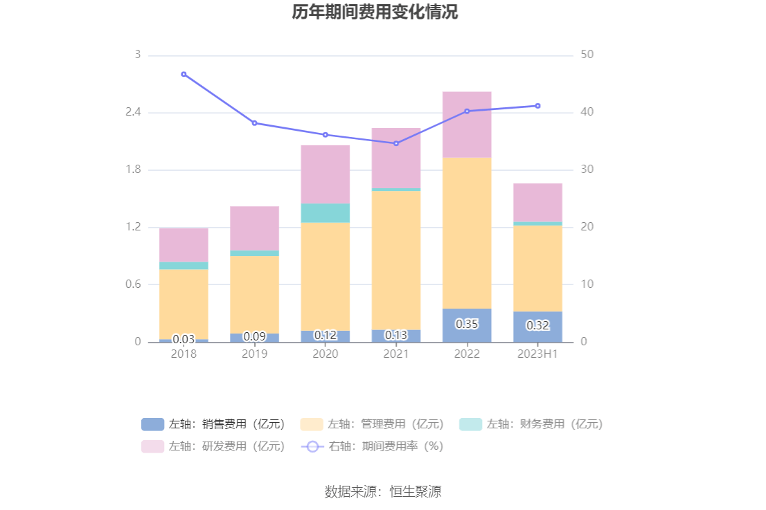 2023年上半年,公司期间费用为1.65亿元,较上年同期增加4285.71万元;但期间费用率为41.20%,较上年同期下降4.36个百分点。其中,销售费用同比增长73.77%,管理费用同比增长20.73%,研发费用同比增长19.11%,财务费用由去年同期的-376.30万元变为378.16万元。