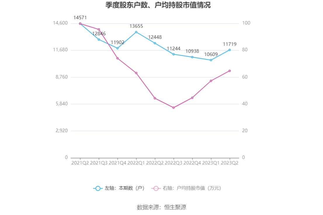 筹码集中度方面,截至2023年二季度末,公司股东总户数为1.17万户,较一季度末增长了1110户,增幅10.46%;户均持股市值由一季度末的57.25万元上升至64.72万元,增幅为13.05%。