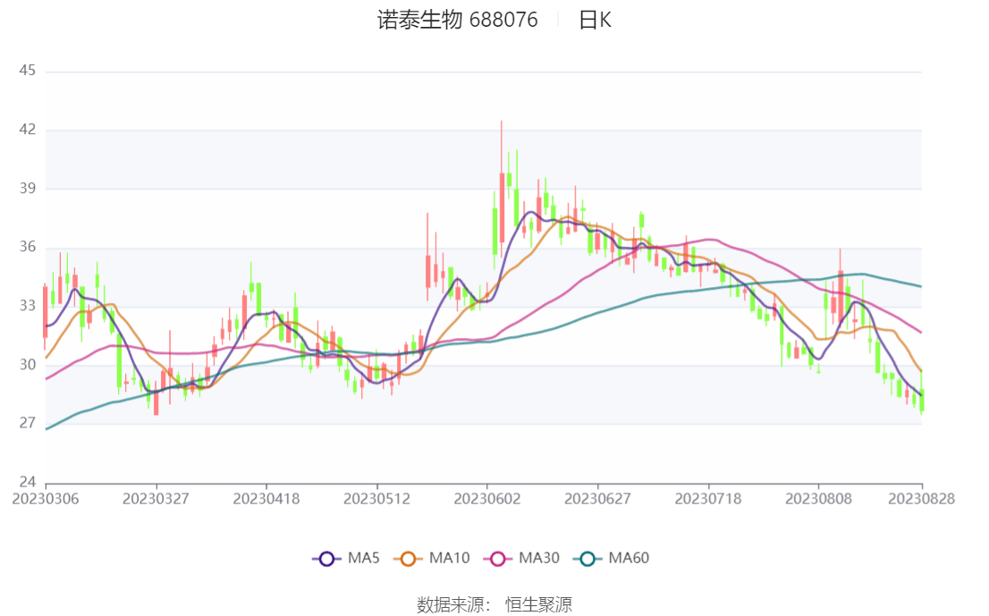 以8月28日收盘价计算,诺泰生物目前市盈率(TTM)约为43.4倍,市净率(LF)约为3.09倍,市销率(TTM)约为7.54倍。