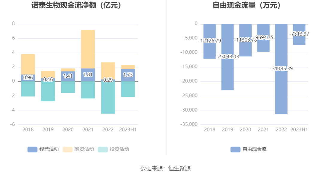 进一步统计发现,2023年上半年公司自由现金流为-7313.97万元,上年同期为-21776.55万元。