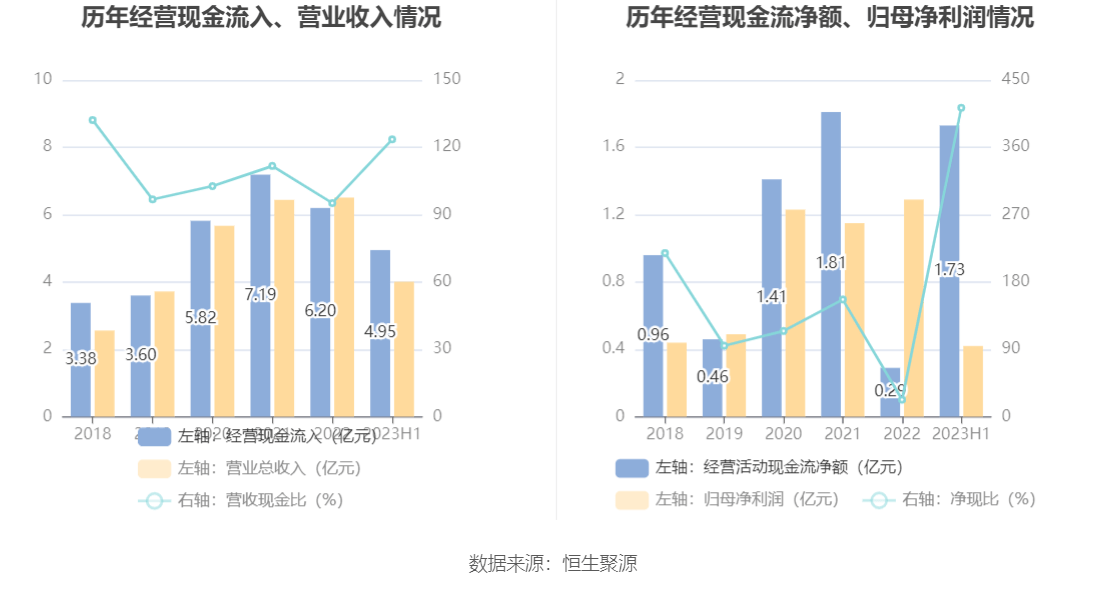2023年上半年,公司营业收入现金比为123.56%,净现比为412.82%。