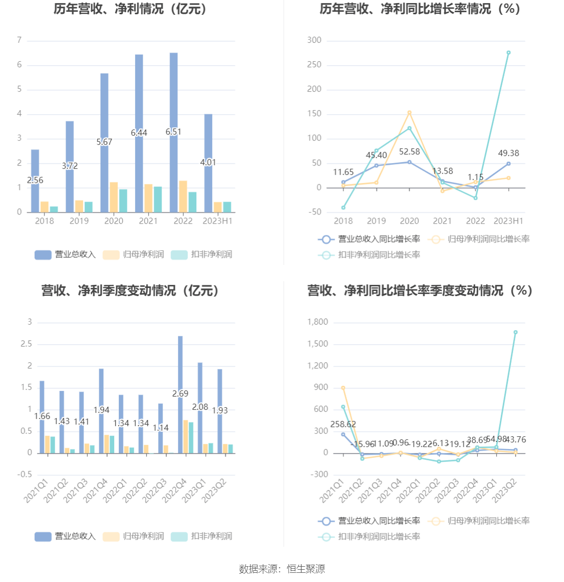 根据半年报,公司第二季度实现营业总收入1.93亿元,同比增长43.76%,环比下降7.37%;归母净利润2083.95万元,同比增长11.20%,环比下降0.83%;扣非净利润1961.88万元,同比增长1668.28%,环比下降16.10%。